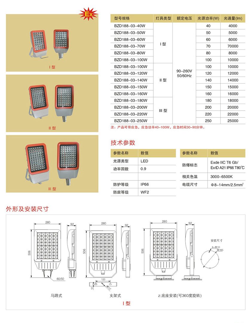 产品中心 防爆(三防)高效LED节能灯具类 BZD188-03系列防爆免维护LED泛光灯(IIC)