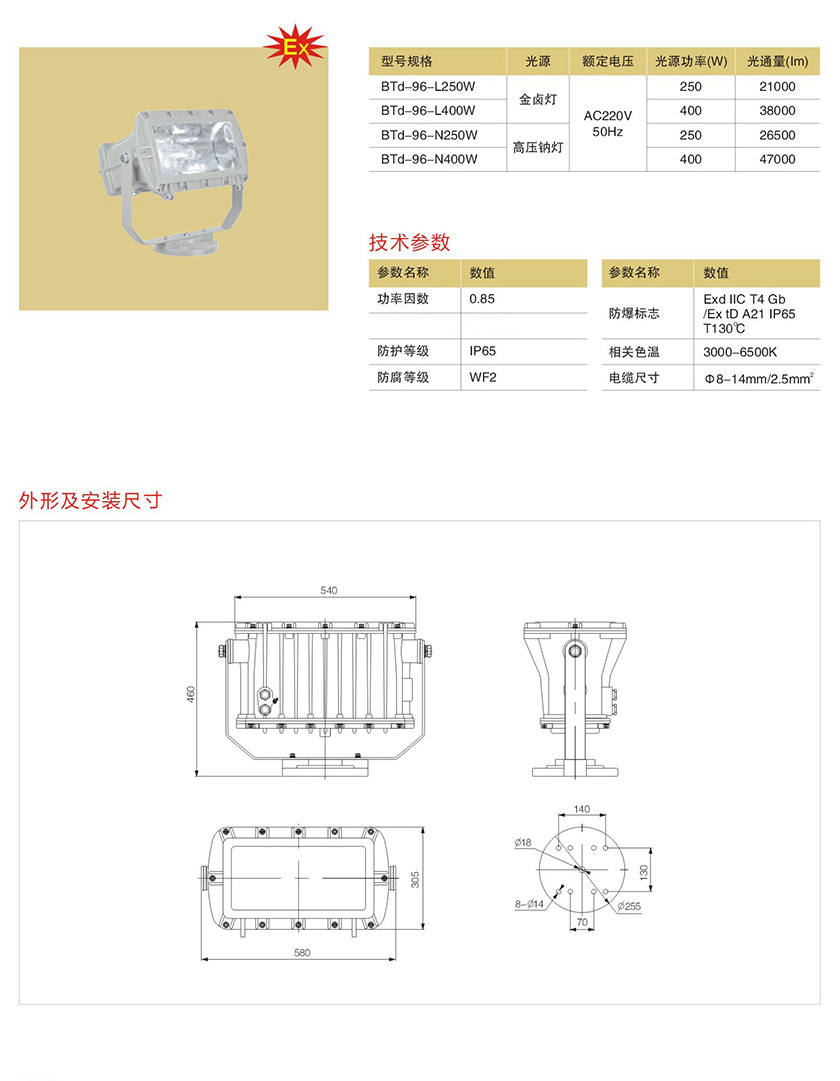 产品中心 防爆灯具类(金卤灯、钠灯) BTd-96防爆外场强光泛光灯(IIC)