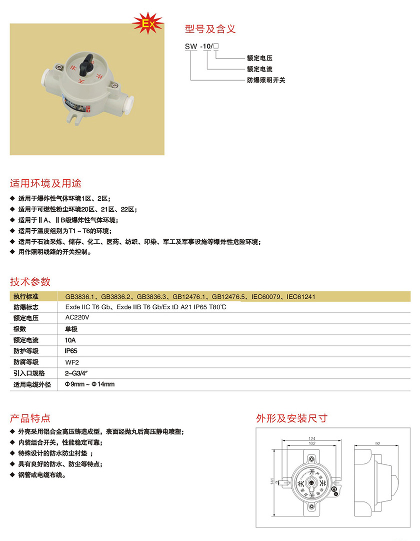 产品中心 防爆电器类 SW-10系列防爆照明开关(IIB、IIC)